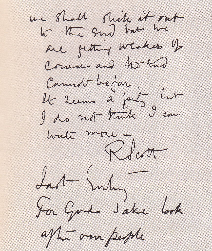 Eight months later, in November 1912, a search party found three frozen bodies in a tent half-buried by snow. Bowers and Wilson were zipped into their sleeping bags, in the attitude of sleep. Scott apparently died after his companions did. His sleeping bag and his coat were thrown open, his diaries stuffed beneath his shoulder. His arm was stretched across the body of his friend Wilson.