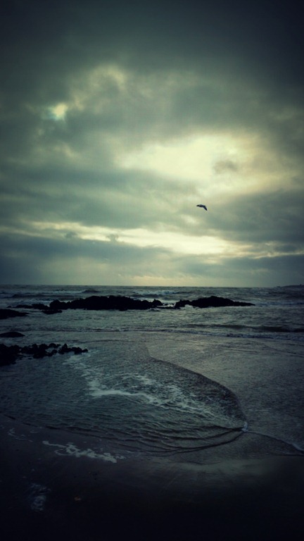 Early one morning I cast to a grey and cold sea under a low misty sky, the waves breaking super white against the rocks. Held h